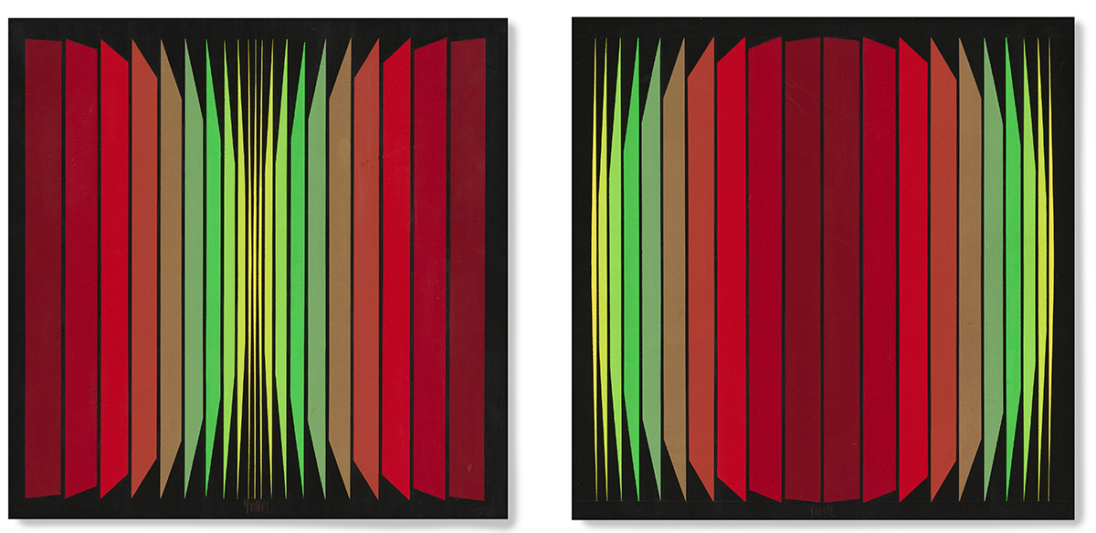 2.Quadrature du cercle (Diptyque) 1972 Each : signed ; signed, titled, dated 1972 and inscribed 1305 on the reverse Each : oil on panel, 32 x 32 cm.